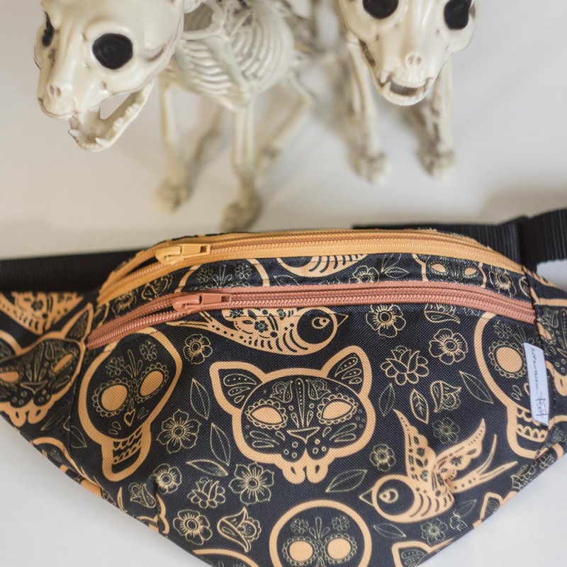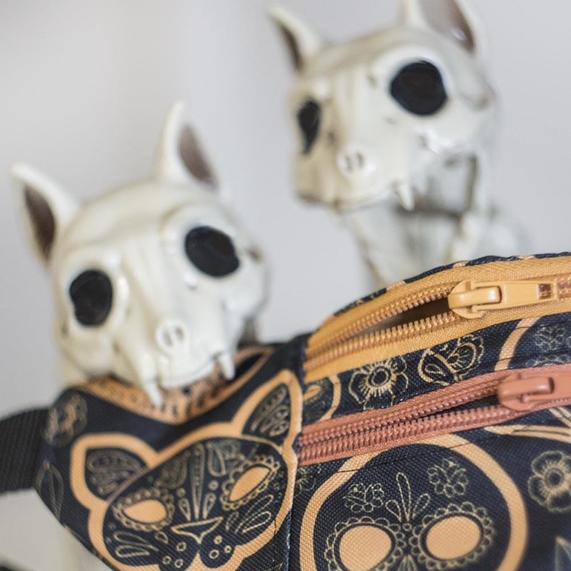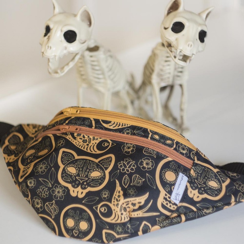 Limitowana perełka dla fanów kultury meksykańskiej i kotów ;-) Nerka uszyta z wodoodpornej tkaniny z kieszonką z przodu i całkiem pakowną główną komorą. W środku podszewka. Pas biodrowy regulowany.