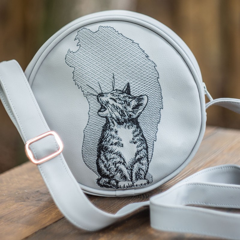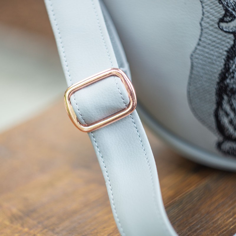 Torebka na ramię z regulowanym paskiem uszyta z imitacji skóry w jasnoszarym kolorze. Na przodzie piękny metaforyczny haft z kotem. W środku podszewka z kieszonką. Elementy metalowe w kolorze różowego złota.