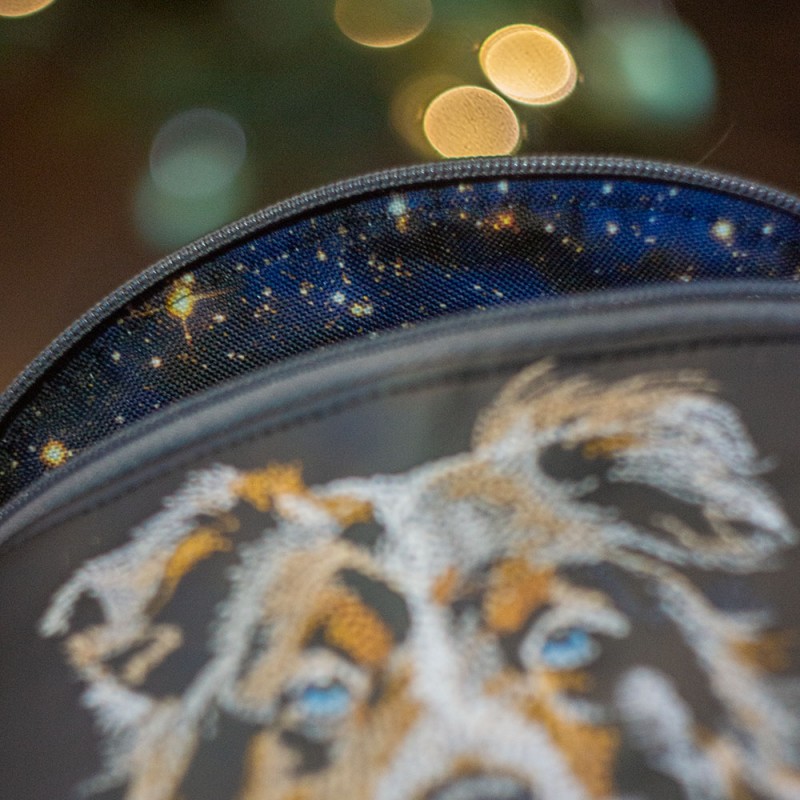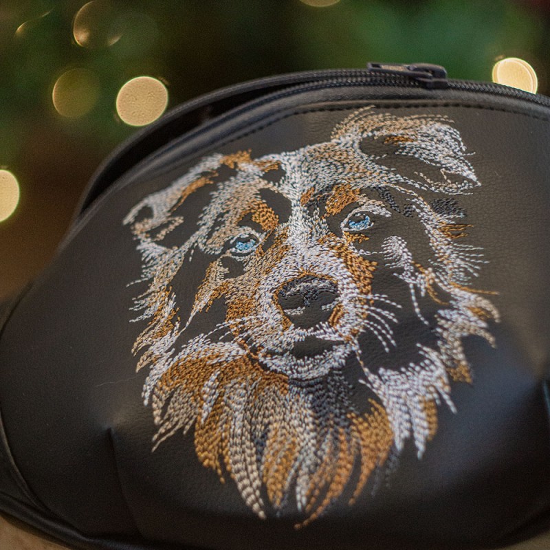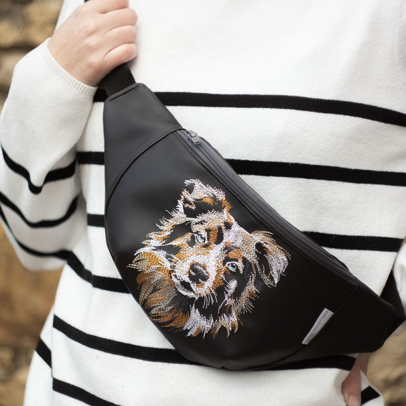 Nerka uszyta z imitacji skóry w kolorze czarnym. Na przodzie piękny subtelny haft owczarka australijskiego. W środku podszewka z kieszonką. Pas biodrowy regulowany.