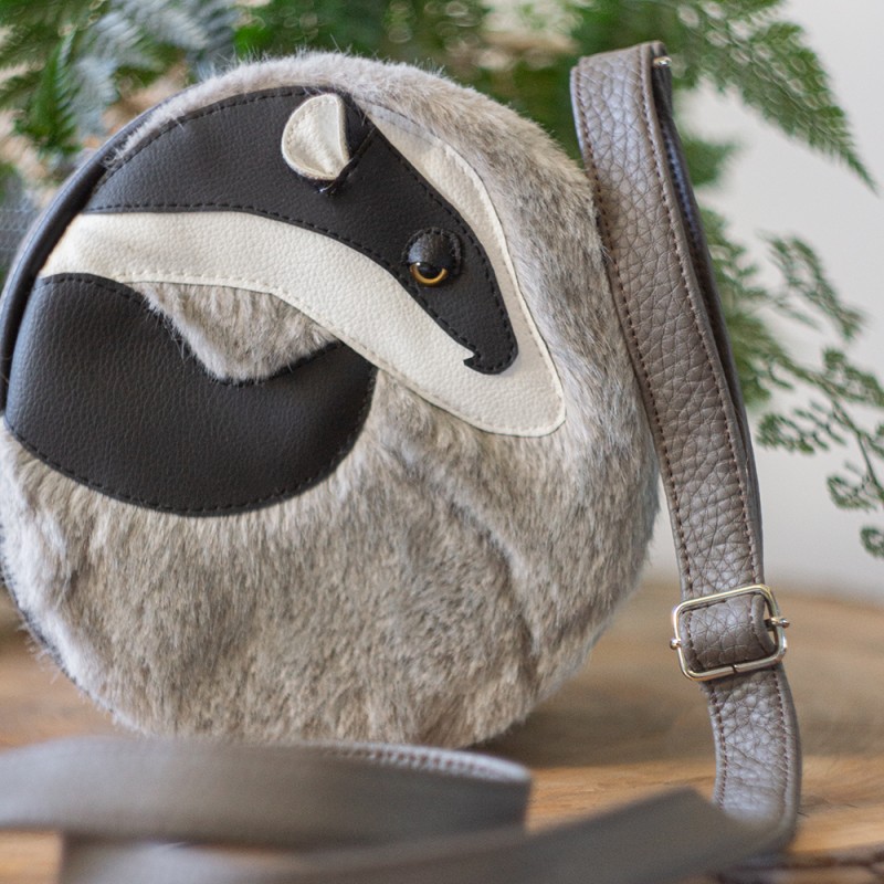 Okrągła torebka uszyta z imitacji skóry i sztucznego futra w kształcie śpiącego borsuka. Zapinana na suwak.