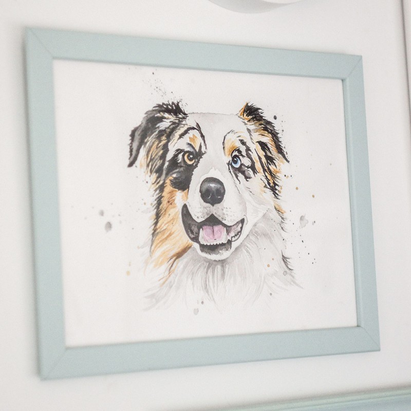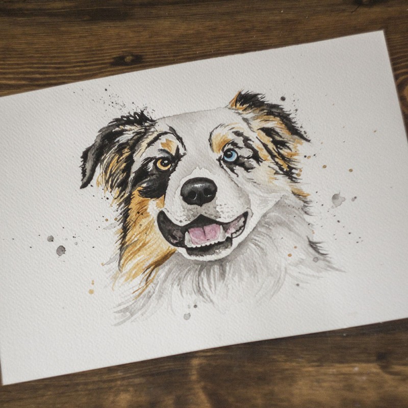 Oryginalna akwarela z portretem Owczarka Australijskiego. Malowana przeze mnie na papierze fakturowanym. Rozmiar A4.