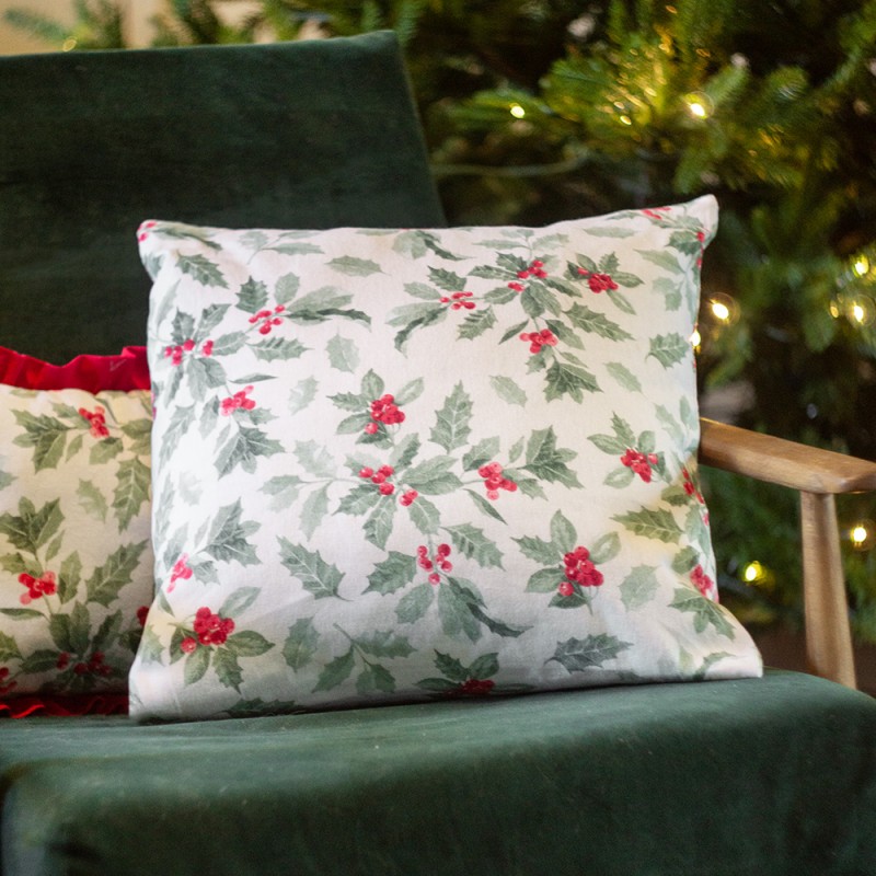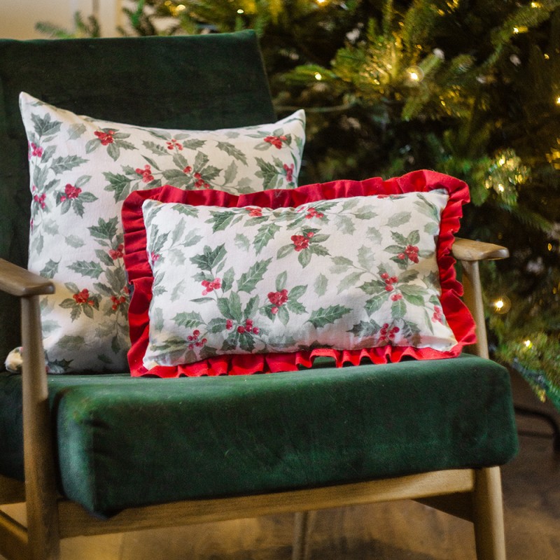 Dwa rodzaje świątecznych poduszek uszytych z bawełny o delikatnym wzorze ostrokrzewów. Do wyboru klasyczna poduszka 40x40cm (poszewka+wkład) lub mniejsza poduszka z falbaną 40x35cm (brak możliwości ściągnięcia).