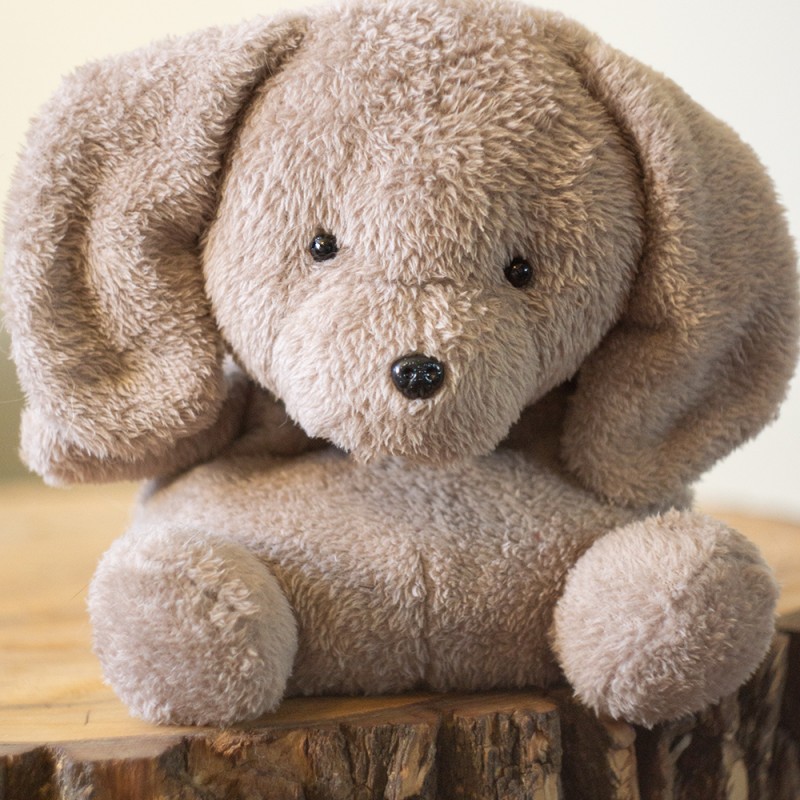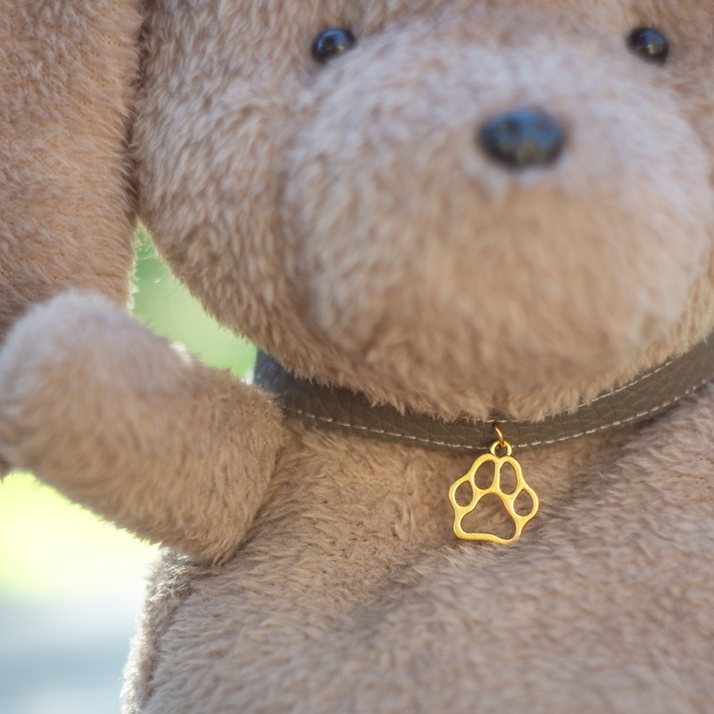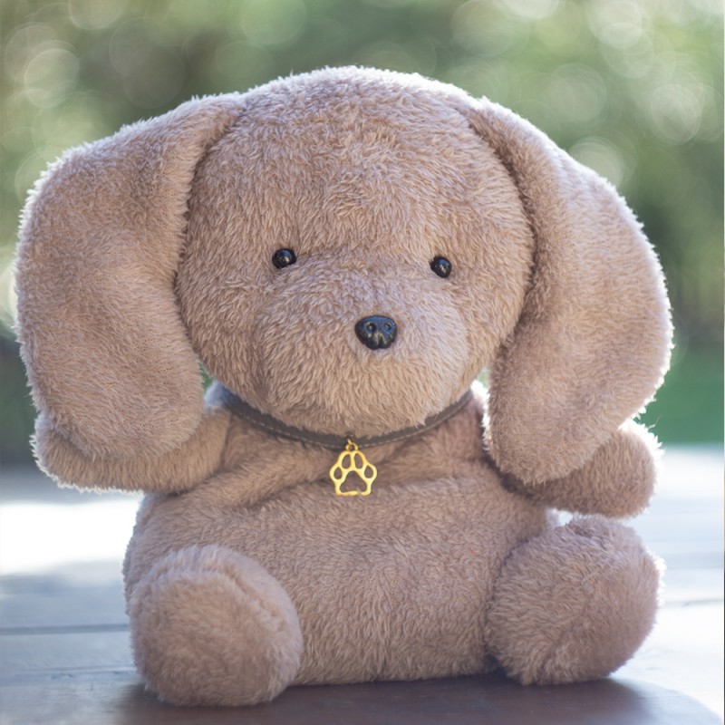 Urocza maskotka psa o lekko oldskulowym dizajnie. Obroża z imitacji skóry ze złotą zawieszką w kształcie łapy. Wypchana kulką silikonową i szkłem obciążeniowym do zabawek (w specjalnej saszetce na "siedzeniu").