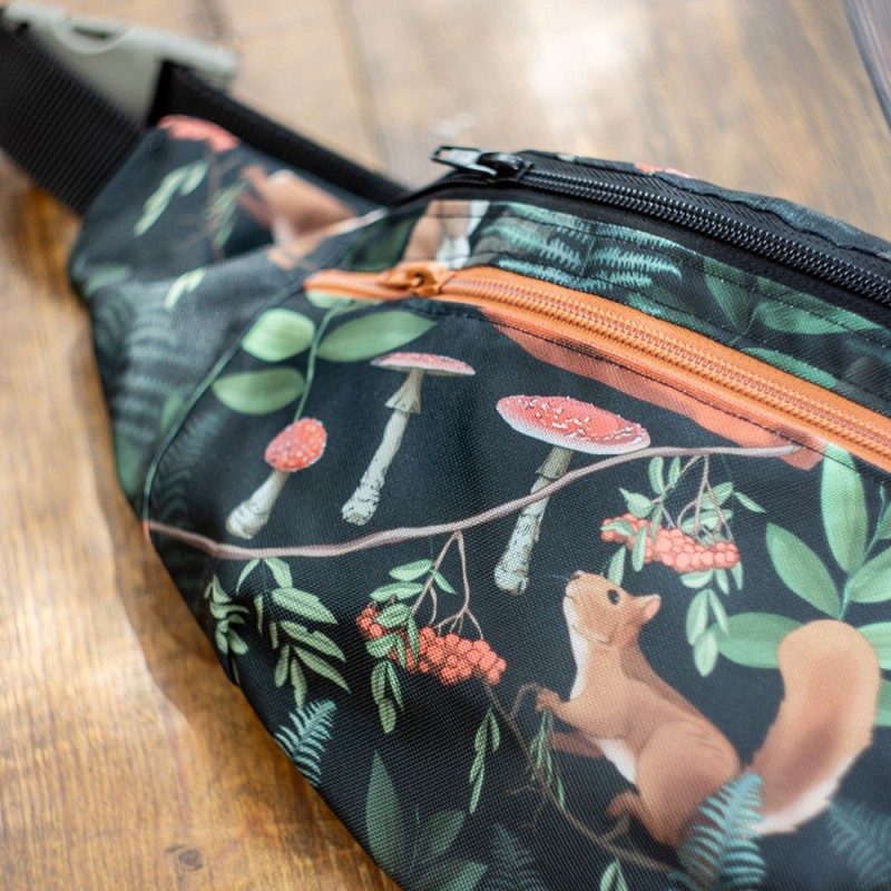 Pojemna nerka uszyta z wodoodpornej tkaniny w piękny leśny wzór. W środku podszewka. Pas biodrowy regulowany. Nerki mogą się różnić umiejscowieniem zwierząt, ich rodzajem, każda jest inna. Jeśli zależy Ci na jakimś konkretnym zwierzaku napisz w uwagach do zamówienia.