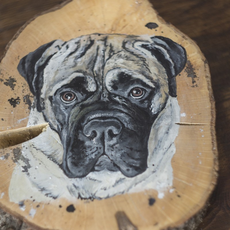Portret Twojego pupila albo inny dowolny malunek na plastrze drewna. Malowany farbami akrylowymi, odpornymi na wodę. Plaster zaimpregnowany olejem.